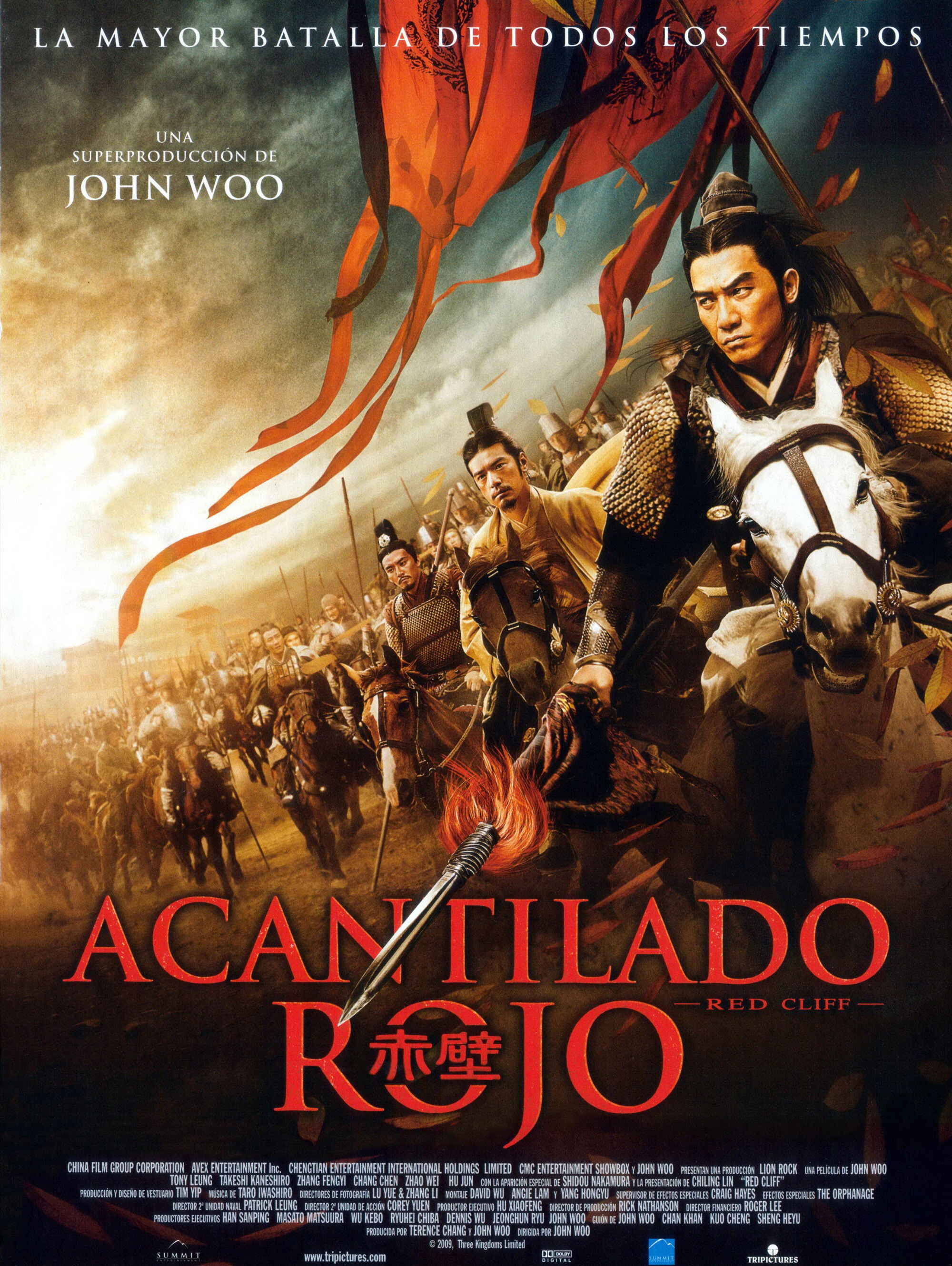 China, finales de la Dinastía Han (208 d.C.). Tras una larga guerra civil, el temible Primer Ministro Cao Cao consigue que el veleidoso Emperador Han le declare la guerra a los reinos de Xu y Wu con el fin de unificar China. Su ejército ataca y derrota al recién creado Reino de Xu, gobernado por el benevolente Liu Bei. Los ciudadanos de Xu huyen bajo la protección de las tropas de Liu Bei y de sus dos generales de mayor rango (y hermanos de sangre): Guan Yu y Zhang Fei. La versión original de «Red Cliff» consta de dos películas de 280 minutos de duración: «Chi Bi» (2008) y «Chi Bi Xia: Jue zhan tian xia» (2009). Para su distribución en Occidente se hizo una sola película de 148 minutos. Se han eliminado además detalles sobre algunos personajes, como las motivaciones de Zhuge Liang para robar las 100.000 flechas, partes de la infiltración de Sung Shangxiang o todas las secuencias de la caza del tigre.